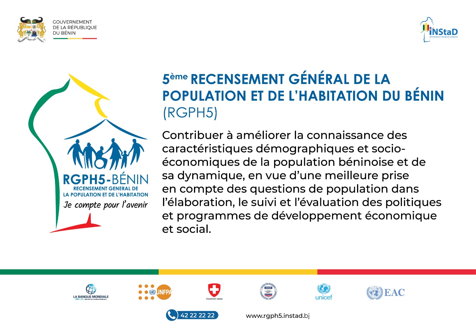 Le RGPH-5 du Bénin, contribuera à améliorer la connaissance des caractéristiques démographiques et socio-économiques de la population béninoise et de sa dynamique, en vue d’une meilleure prise en compte des questions de population dans l’élaboration, le suivi et l’évaluation des politiques et programmes de développement économique et social.